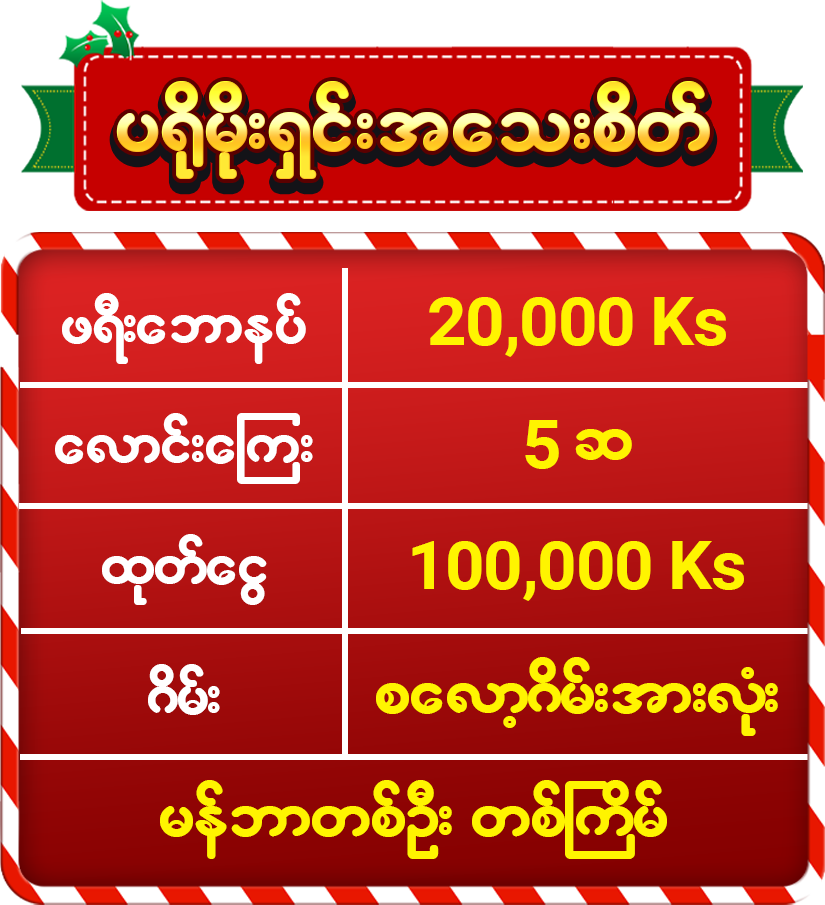 ✅ ပ႐ိုမိုးရွင္းအား 01/09/2025 ေနာက္ပိုင္း 3,000 က်ပ္ေငြသြင္းကစားထားေသာ မန္ဘာဝင္တိုင္း ပါဝင္ႏိုင္သည္။မန္ဘာတစ္ဦးကိုတစ္ႀကိမ္ရယူႏိုင္သည္။