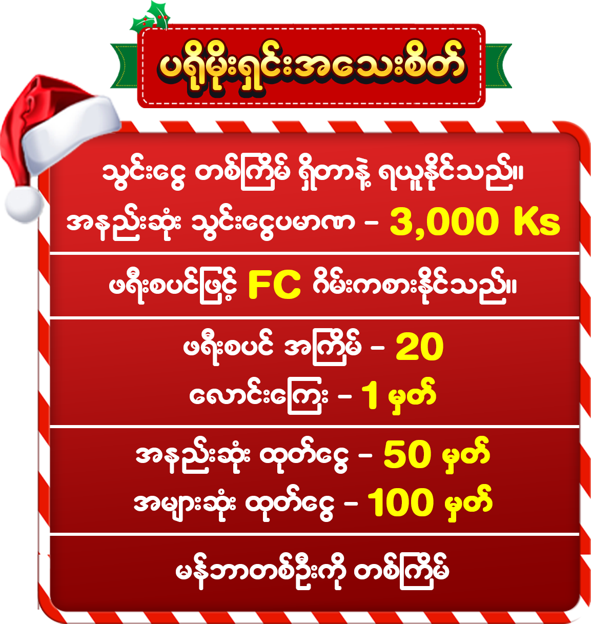 ❄️ေဘာနပ္အား (11/11/2025) ရက္တြင္ စတင္ေပးမည္ျဖစ္ၿပီး (11/12/2025) ထိတစ္လအတြင္းေပးမည္ျဖစ္သည္။ သတ္မွတ္ခ်က္ျပည့္မီပါက Customer Service သို႔ ဆက္သြယ္ၿပီး မန္ဘာတိုင္း တစ္ဦးလွ်င္ တစ္ႀကိမ္ ခံစားခြင့္ရွိသည္။